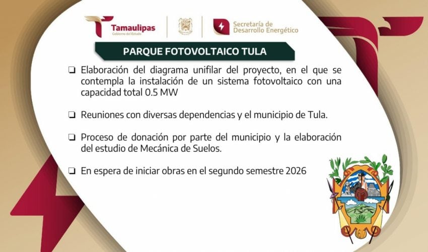Ciudad Victoria, Tamaulipas.– Como parte del compromiso del Gobierno de Américo Villarreal para dar paso a la transición energética y el impulso a las energías limpias, la Secretaría de Desarrollo Energético anunció que se trabaja en un proyecto fotovoltaico en el municipio de Tula.