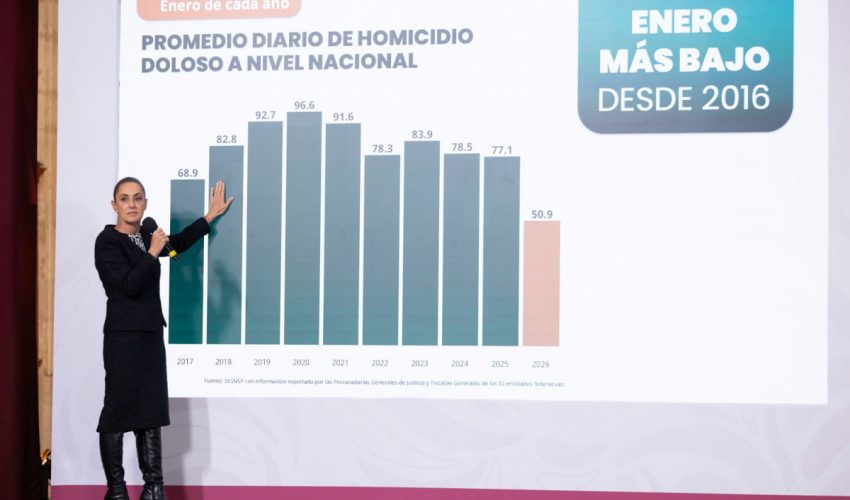 Agregó que, a nivel nacional, si se compara octubre de 2024, cuando se registraron 636.6 delitos de alto impacto en promedio diario, contra 441.3 que se registraron en enero de 2026, se tiene una reducción del 31 por ciento; destacando que enero de 2026 es el mes más bajo, también, de los últimos 17 meses.