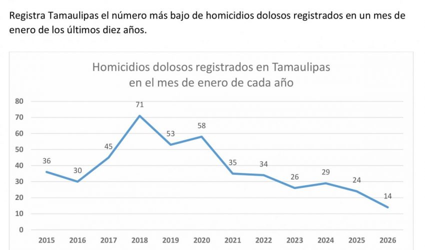 Ciudad Victoria, Tamaulipas. – En Tamaulipas se registraron 14 homicidios dolosos en enero de 2026, siendo la cifra más baja para este mes en los últimos diez años, además de representar una disminución anual del 46.2 por ciento en el promedio diario de este delito, respecto a enero de 2025, destacando como una de las entidades con mejores indicadores a nivel nacional, como resultado de la estrategia de seguridad desde el inicio del gobierno de Américo Villarreal.