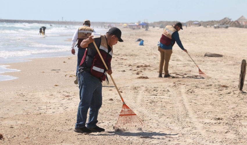 La Pesca, Soto la Marina, Tamaulipas.– Con el objetivo de cuidar la salud ambiental del litoral y brindar tranquilidad a las familias que visitan las costas, el Gobierno de Tamaulipas intensificó este domingo los trabajos de monitoreo y retiro de residuos de hidrocarburo en la playa del poblado La Pesca y Tepehuajes del municipio de Soto la Marina.
